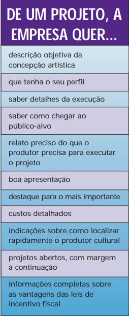“Elas bem que poderiam divulgar mais o que esperam de um projeto cultural, coisa que só acontece com algumas poucas empresas grandes. Isso ajudaria a desenvolver ainda mais esse mercado”.