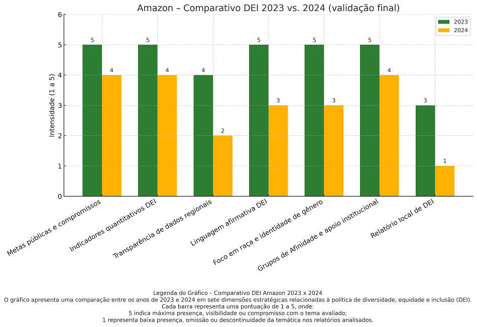 Até 2023, a Amazon vinha desenvolvendo uma comunicação institucional sólida em torno dos princípios de diversidade, equidade e inclusão (DEI). O relatório global daquele ano — Amazon Global Diversity, Equity and Inclusion Report 2023 — apresentava metas claras, indicadores por gênero e etnia, e dados segmentados por país, com foco específico nos Estados Unidos.