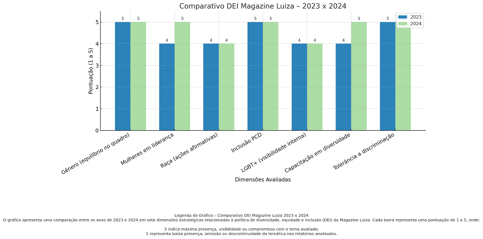 Nenhum tema ligado à diversidade, inclusão ou equidade foi removido do relatório 2024 do Magazine Luiza em relação ao de 2023. Magalu tem um histórico forte de promoção da diversidade e isso se manteve inalterado – não houve qualquer recuo na defesa dessas pautas.