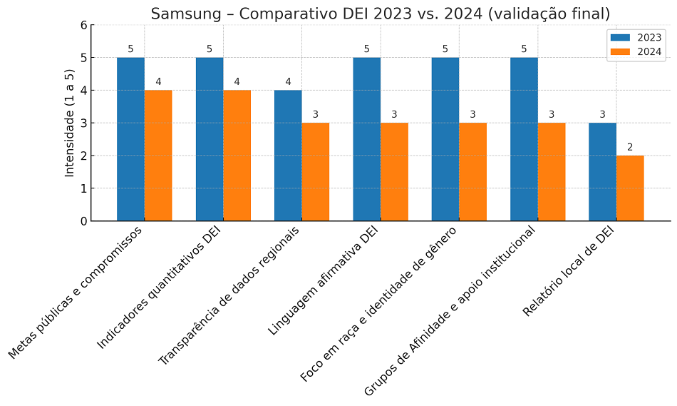 Em 2023, a Samsung incluía seções sobre DEI com destaque para equidade de gênero, inclusão de pessoas com deficiência e parcerias educacionais voltadas para jovens em situação de vulnerabilidade social. A linguagem institucional começava a incorporar termos como “diversidade geracional”, “ambiente de trabalho equitativo” e “responsabilidade social corporativa orientada por valores humanos”.