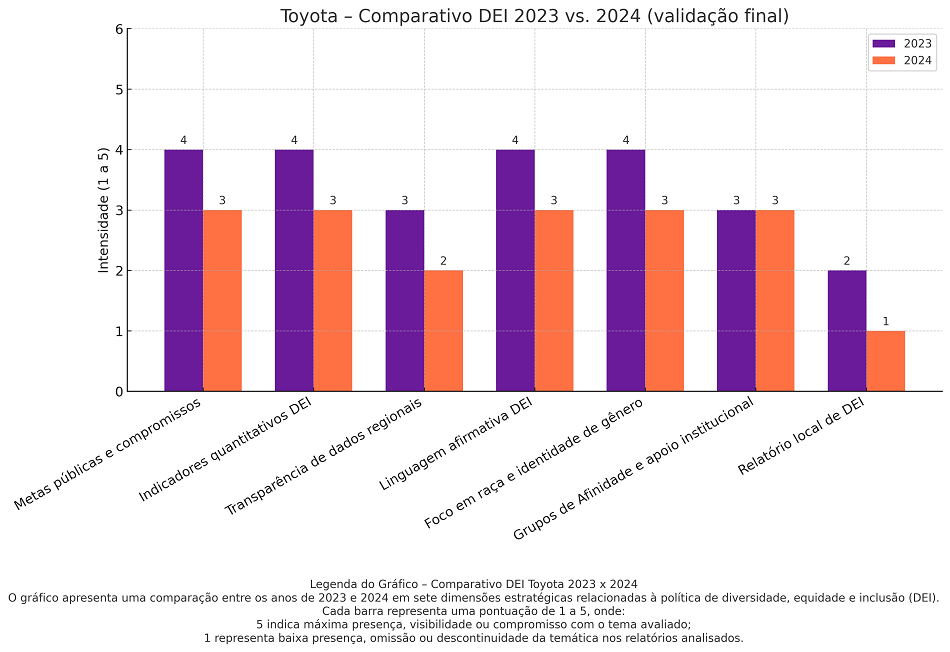 A Toyota permanece atuando em inclusão de maneira institucionalizada e silenciosa. Sua escolha de suprimir vocabulário identitário e remover dados públicos aponta para uma estratégia de neutralidade narrativa.