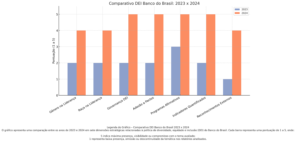 Outra evidência é a participação do BB no Pacto pela Diversidade nas Estatais, coliderado pelo Ministério da Gestão em 2024, reforçando seu comprometimento colaborativo (essa iniciativa não existia em 2023). Observa-se também que em 2024 o BB passou a integrar índices e rankings de diversidade: o relatório menciona que o banco foi destaque na categoria “30% de pessoas negras ou indígenas em posição de liderança até 2025” e “apoio ao empreendedorismo de mulheres” em premiação da ONU, enquanto no relatório anterior não havia esse tipo de reconhecimento.