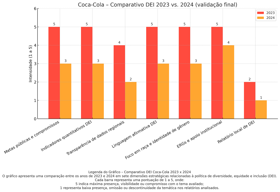 A comparação entre os relatórios de 2023 e 2024 revela uma inflexão clara no posicionamento da Coca-Cola. A empresa deixou de explicitar termos e compromissos associados ao discurso afirmativo de DEI, substituindo-os por uma abordagem genérica e menos mensurável.