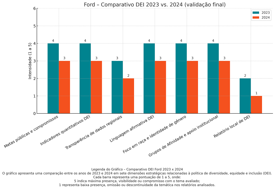 A Ford passou de uma comunicação afirmativa e engajada em 2023 para uma abordagem mais conservadora e neutra em 2024. A presença de termos politizados foi eliminada, as metas deixaram de ser detalhadas e a estrutura editorial passou a evitar a exposição explícita das iniciativas identitárias. O que antes era símbolo de transformação e compromisso social agora é apresentado como parte da gestão interna de talentos e cultura.