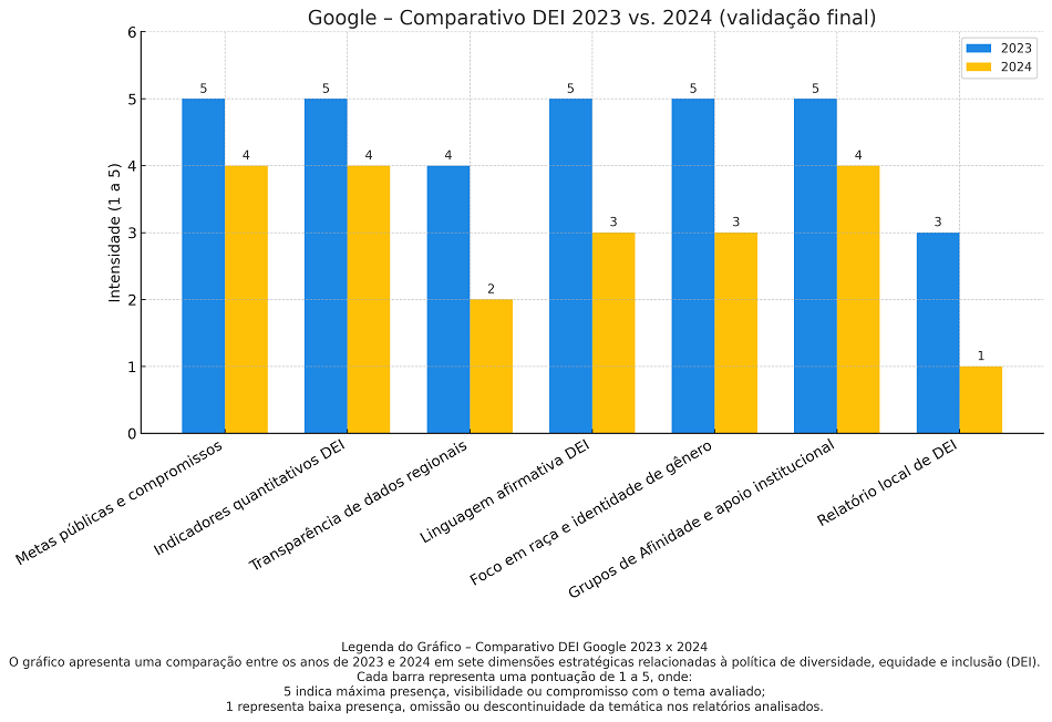 A comparação revela uma retração institucional. Em 2023, a Alphabet utilizava seu capital de marca para liderar o discurso corporativo em prol da diversidade. Em 2024, mantém a base programática, mas abandona a postura de protagonismo público. A escolha por relatórios separados, menos promovidos, e por linguagem neutra, marca uma mudança editorial com consequências simbólicas significativas. A política de inclusão permanece, mas deixa de ocupar o mesmo espaço simbólico na identidade institucional da empresa.