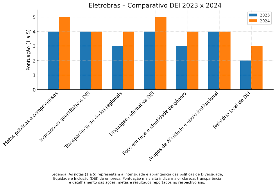 Não há ausência de temas: o relatório 2024 cobre desde não discriminação no Código de Ética até iniciativas de empoderamento e indicadores – tudo que havia antes, atualizado. Portanto, a Eletrobras apresentou evolução positiva nos resultados e continuidade na profundidade do relato de diversidade entre 2023 e 2024, com evidências de que a linguagem permaneceu comprometida e, se algo mudou, foi para mais detalhe e transparência sobre os progressos alcançados.