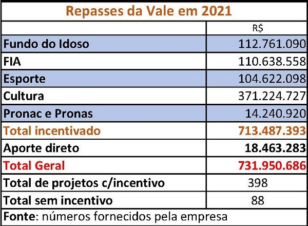 PERGUNTA DO MILHÃO – E os investimentos do Instituto vão além da cultura. A Vale repassou R$ 713.487.393 em recursos incentivados por meio de aportes a Fundos de Direitos e apoio a projetos de organizações da sociedade civil. Ao todo foram 398 iniciativas beneficiadas a partir de seis leis de incentivo fiscal: Fundo para Infância e Adolescência; Fundo do Idoso; Lei do Esporte, Lei Federal de Incentivo à Cultura, Programa Nacional de Apoio à Atenção Oncológica (Pronon) e Programa Nacional de Apoio à Atenção da Saúde da Pessoa com Deficiência (Pronas/PCD). A forma como esses repasses foram feitos pode ser vista na tabela ao lado.