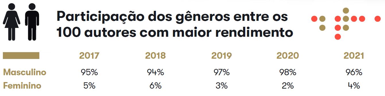 A média de apenas 4 mulheres entre os 100 autores com maior rendimento nos últimos cinco anos mostra que o cenário ideal ainda está longe. Dos R$ 901 milhões distribuídos em direitos autorais de execução pública para compositores, intérpretes, músicos, editores e produtores fonográficos, além das associações de música, durante 2021, as mulheres receberam pouco mais de 7%.