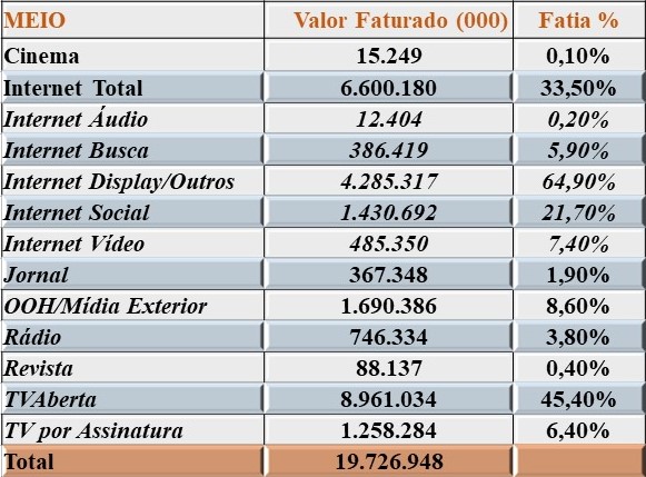 Porém os números indicam que a Internet Total, envolvendo todas as mídias desse segmento, está em franca ascensão, com destaque para os displays em redes (Google Ads, por exemplo), seguida da Internet Social, conforme mostrado na tabela abaixo.